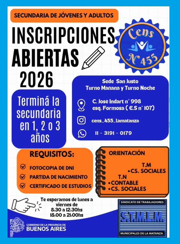 Para terminar el secundario con título oficial en Nuestro CENS (Centro Educativo de Nivel Secundario) N° 455, debes ser mayor de 18 años, acercarte a un CENS cercano de todos los que tenemos alrededor de todo el Partido de La Matanza (para quienes tienen materias pendientes) o Adultos, completar la preinscripción y la documentación requerida (DNI, analítico previo, etc.) para obtener el título de Bachiller con validez nacional, cursando en turnos mañana, tarde o noche (turno disponible según Sede de C.E.N.S) en una modalidad adaptada a jóvenes y adultos.