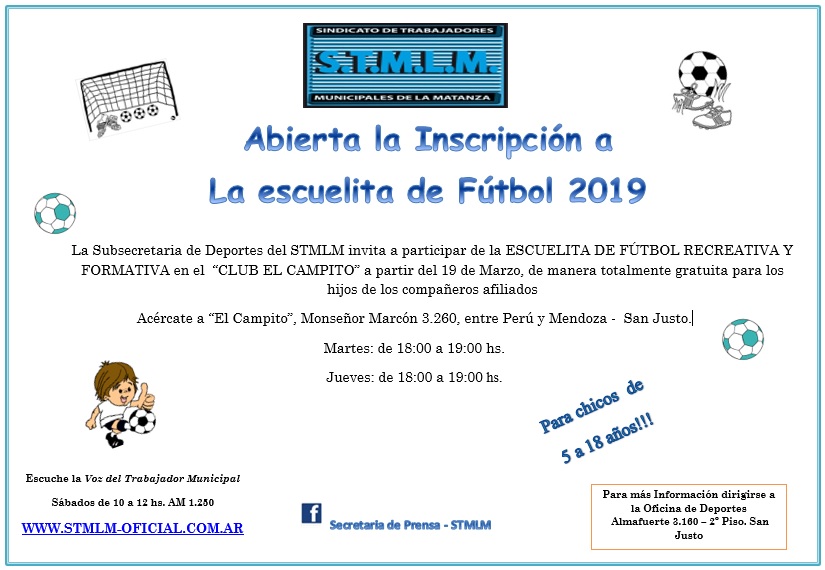 El martes 19 de Marzo vuelve la tan esperada Escuelita de Futbol Recreativa y Formativa “El Campito” para los hijos de nuestros afiliados al Sindicato de Trabajadores Municipales de la Matanza (STMLM) desde los 5 años hasta los 18 años, a cargo de la subsecretaria de Deportes y con la colaboración de los compañeros Marcelo Ocampo, Antonio Rego y Hector Caño.