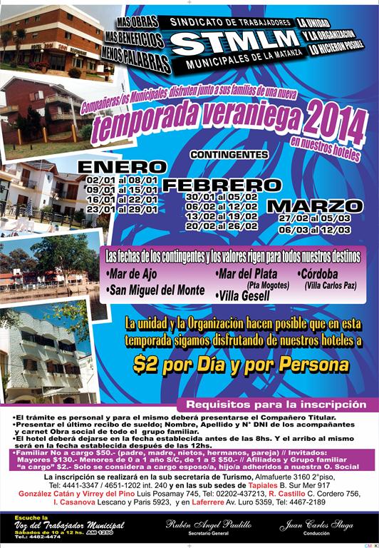 Para terminar aclaramos que los contingentes son semanales y comienzan el día 2 de enero de 2.014, los compañeros deben anotarse en la Of.de turismo de nuestra sede central o bien en las sub. sedes sindicales.